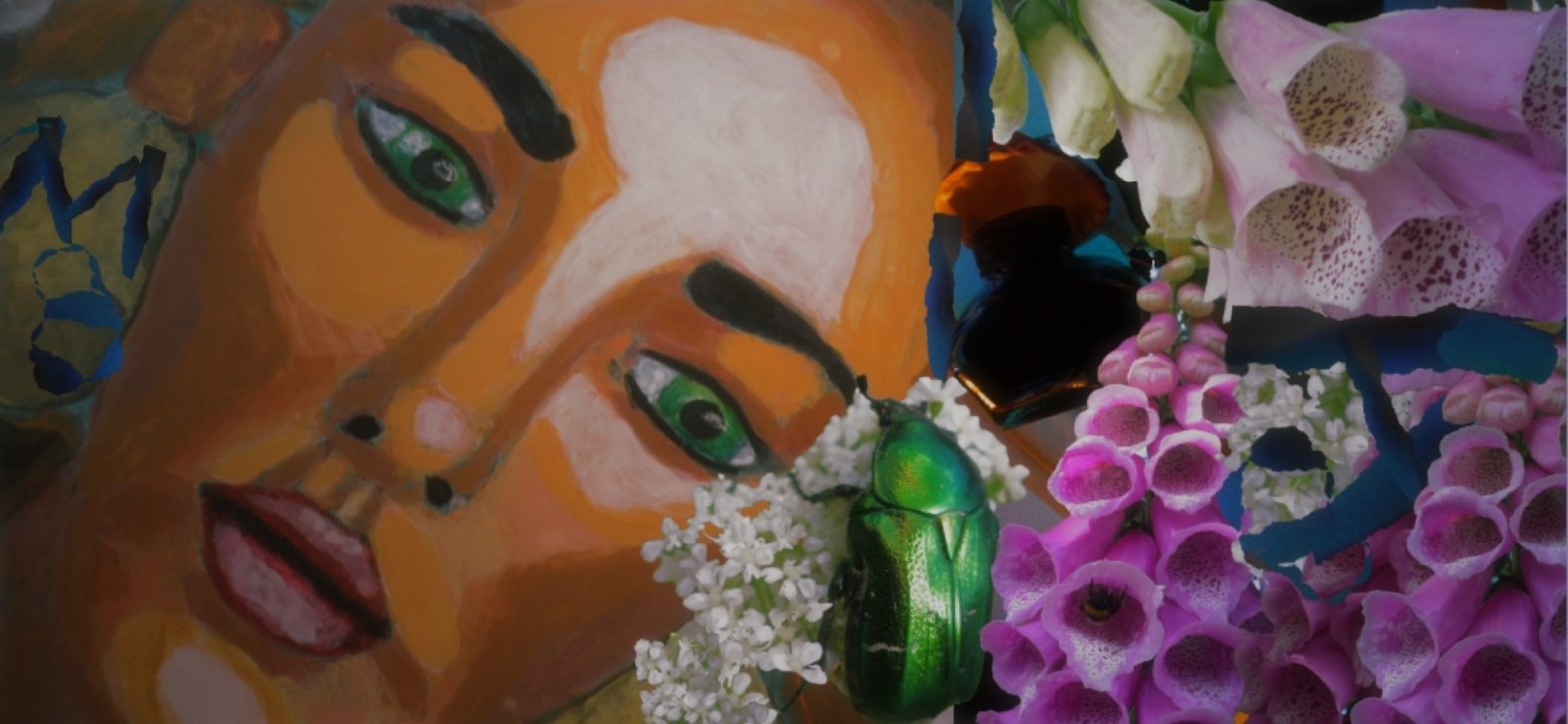 Koliažas (2026). Piešinys (pop., guaš., 42 x 29 cm.) ir kelių nuotraukų fragmentai.
